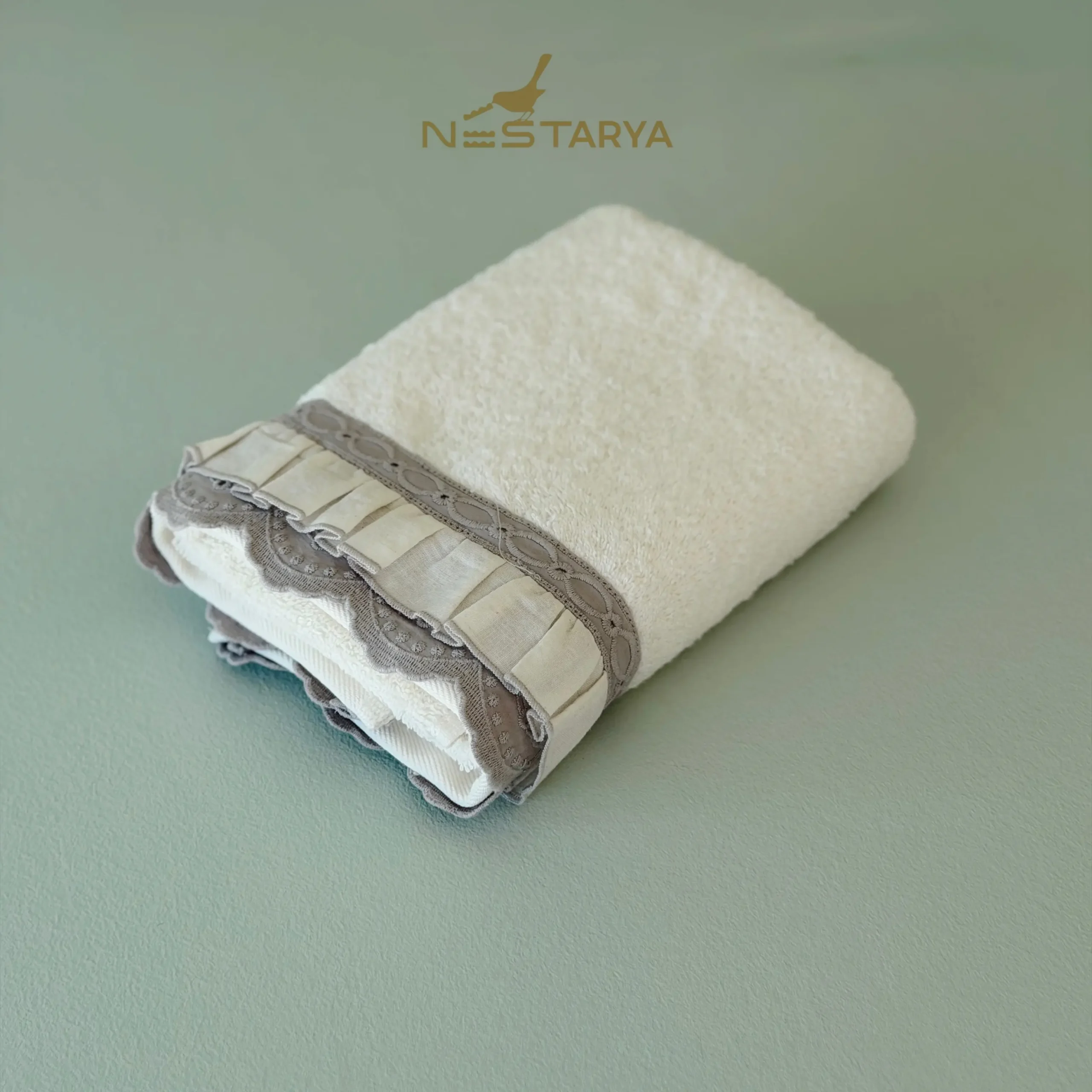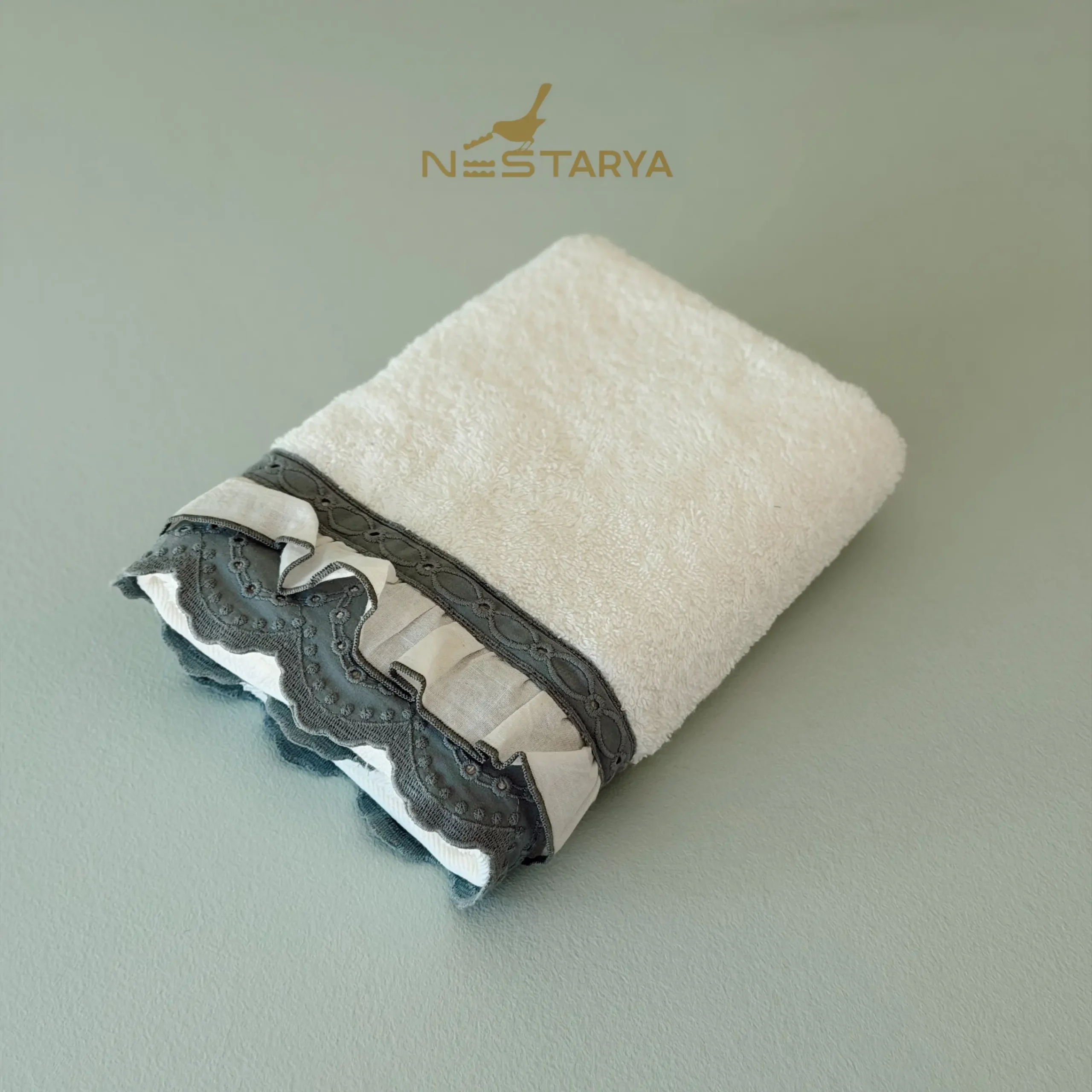 حوله آلسا با طراحی منحصر بفرد (گیپور دوزی شده) ،لطافت و سبک بودن در کنار آبگیری بالا ،تولید شده از پنبه ۱۰۰ درصد ارگانیک (انتخابی مناسب برای خاص پسندان)
